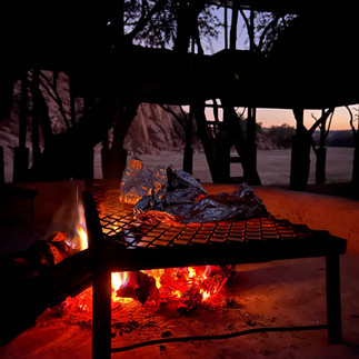 I follow Rudi’s advice and open a beer before lighting the fire, piling on twisted branches of fallen, dense hardwood which burn well. The coals glow for hours. We cook at leisure, inexpertly. It is charred but edible. Tomorrow’s supper will be better. We sit chatting and staring at the fire (“bush TV”) for a while before turning in early.